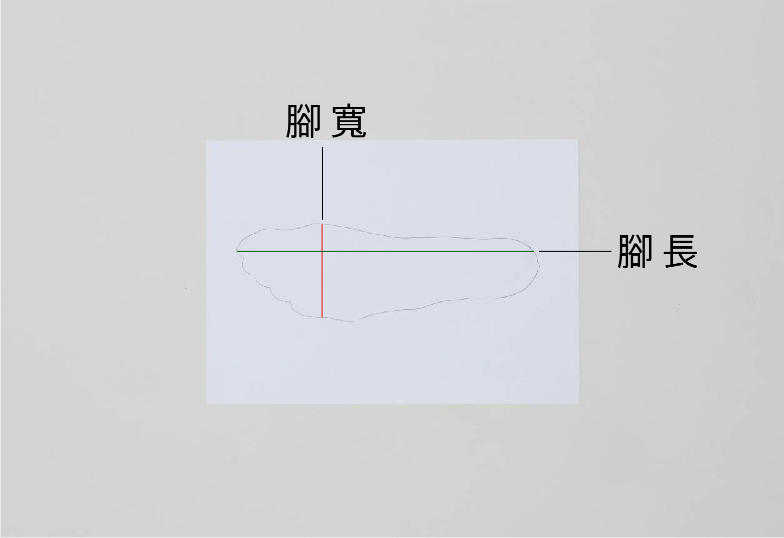 測量方式: 將腳踩在紙上,劃一圈後,測量上面的腳長寬